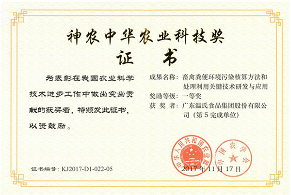 神农中华农业科技奖一等奖-好博(中国)体育股份《畜禽粪便情形污染核算要领和处置惩罚使用要害手艺研究与应用》
