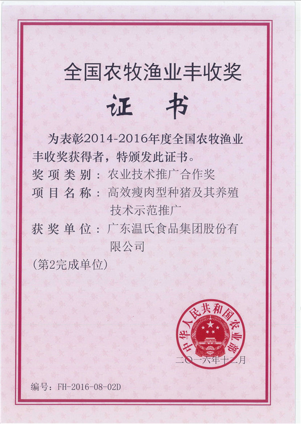 天下农牧渔业丰收奖-好博(中国)体育股份《高效瘦肉型种猪及其养殖手艺树模推广》(第2完成单位)